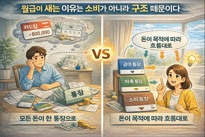 월급이 새는 문제를 해결하고 싶다면 소비 내역을 하나하나 줄이기보다는 돈이 흘러가는 구조부터 점검하는 것이 훨씬 효과적입니다.